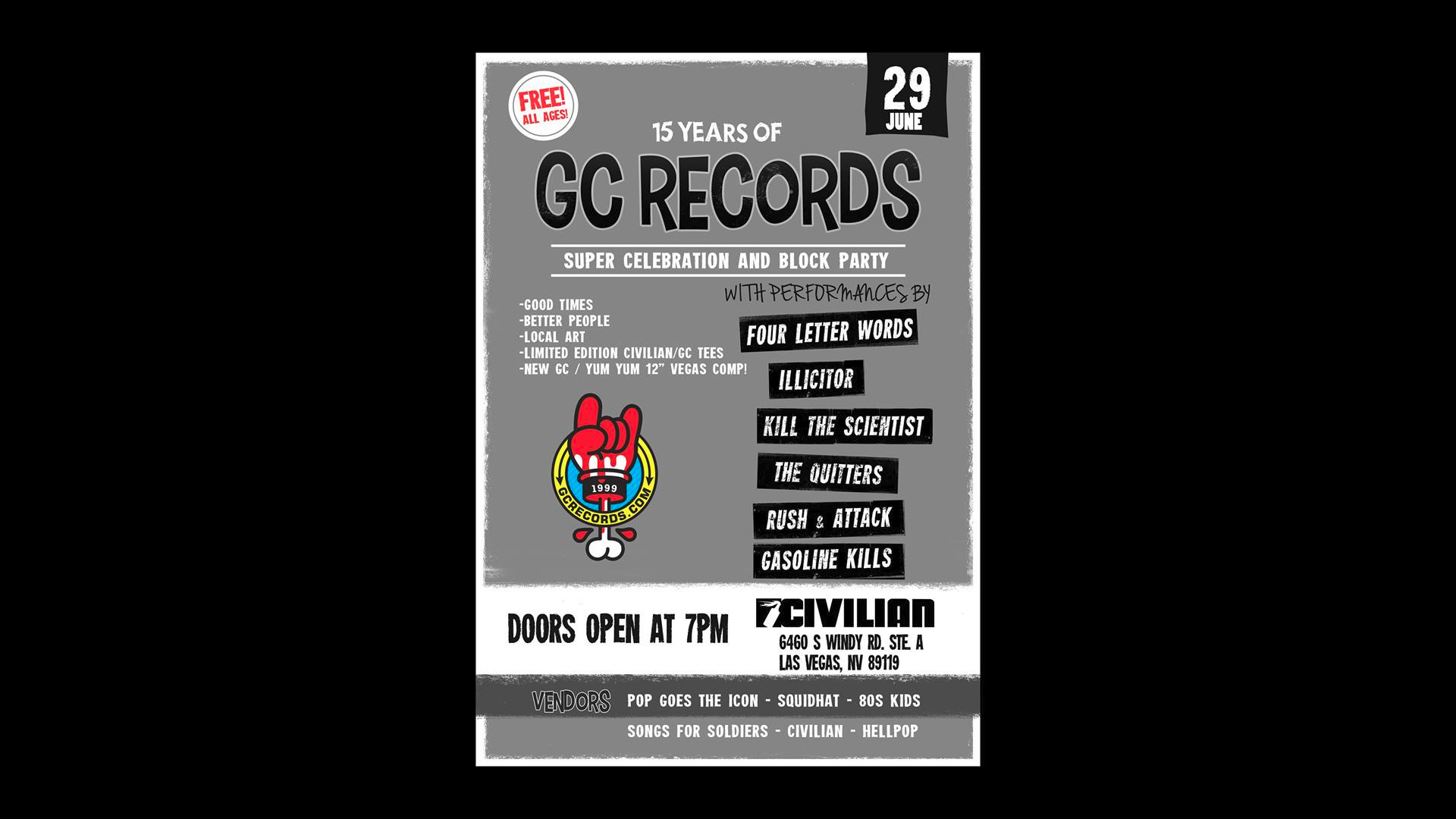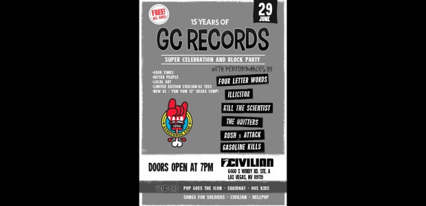 Vegas-based DIY punk rock label Geykido Comet “GC” Records is turning 15 this year and they’re putting on a party to celebrate. The “Super Celebration and Block Party” is set to take place on Sunday, June 29th at Civilian Clothing HQ on Windy Road Street and boasts a lineup that includes Illicitor and Four Letter Words (see the flyer below for the full list of bands).