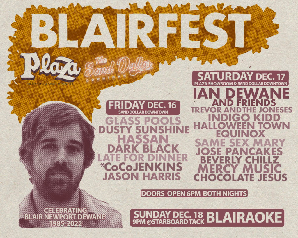 In Honor of Blair Dewane, fellow musicians and friends have organized a 3 day celebration of life dubbed Blairfest. The 3 day celebration will take place on December 16th to the 18th, with the first two nights at the Plaza’s Sand Dollar. The festival will feature performances from Blair’s wide community of musicians like: Indigo Kidd, Same Sex Mary, Mercy Music, Dark Black, Hassan Hamilton and many more. Also performing will be Ian Dewane and former members of Rusty Maples and The Skooners performing renditions of Blair’s catalog of songs. The weekend will close with Blairaoke on Sunday the 18th at Starboard Tack.