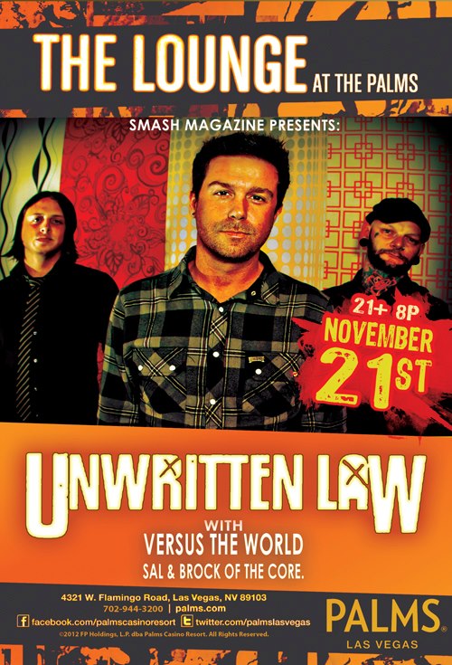 To enter, you need to be following Punks in Vegas and TheCore. on Facebook. Then, all you need to do is post “I’m entering to win a pair of tickets to see Unwritten Law at the Palms Lounge!” on our wall before 6 AM PST on Tuesday, Nov. 20.