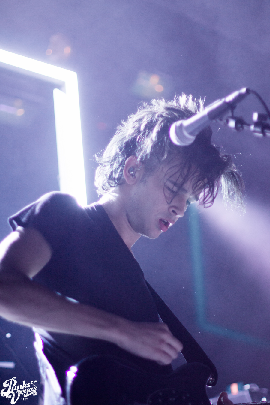 After a quick changeover, The 1975 took the stage to thunderous applause, kicking things off with the instrumental “The 1975” right into album opener “The City.” I have to mention what a great job this band does with fairly minimal stage setup. They use a big, glowing rectangle to encase drummer George Daniel and frame frontman Matthew Healy. Combined with a thick veil of mist and soft, slowing flashing lights, it gave the small Vinyl stage a hugely professional and interesting look that betrayed the minimal design. The band sounded great and even better, they looked like they were having a blast, particularly bassist Ross MacDonald, who had a huge grin on his face the whole time. They weren’t much for lengthy stage banter but Healy humbly mentioned a few times how cool it was to headline a show in Vegas and how nice it was to be playing in a smaller venue where he could see everyone’s faces.