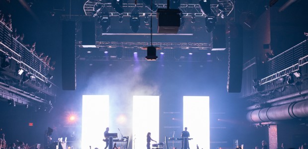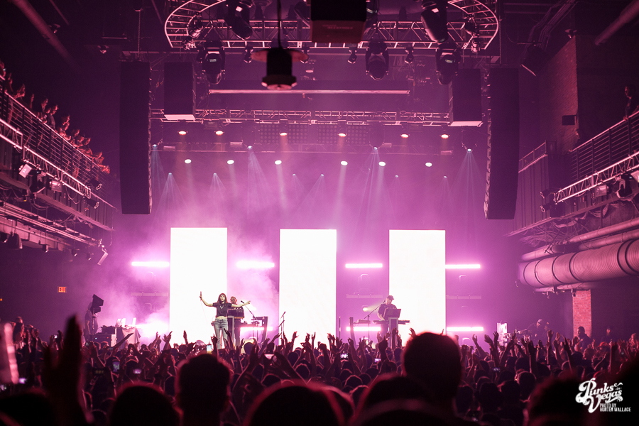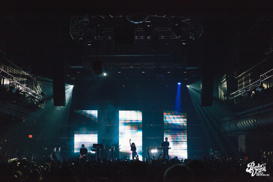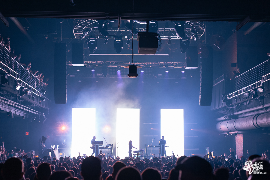 As the lights dimmed for the headliners, CHVRCHES members Iain Cook and Martin Doherty took stage, and the backlit screen slowly rose to reveal the powerful silhouette of frontwoman Lauren Mayberry. The opening notes to “Never Ending Circles” came through, and more than 2000 people cheered as she took her position at the front of center stage.