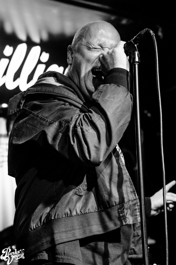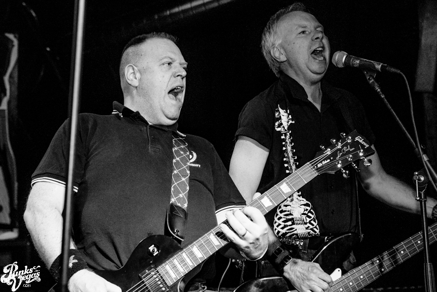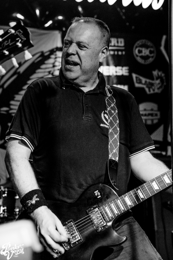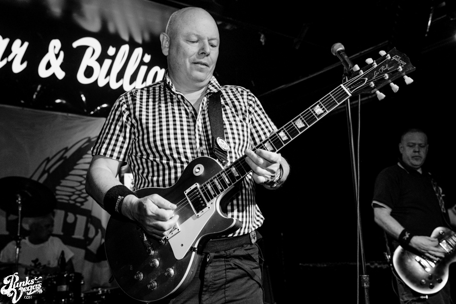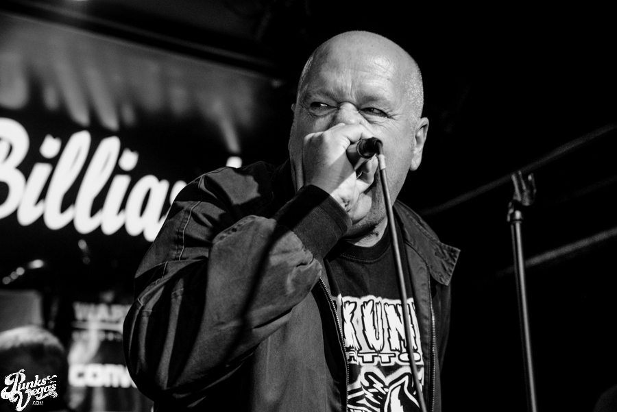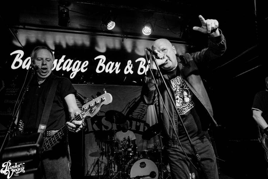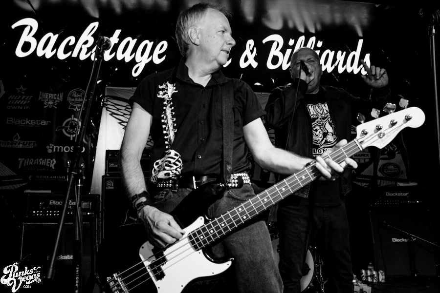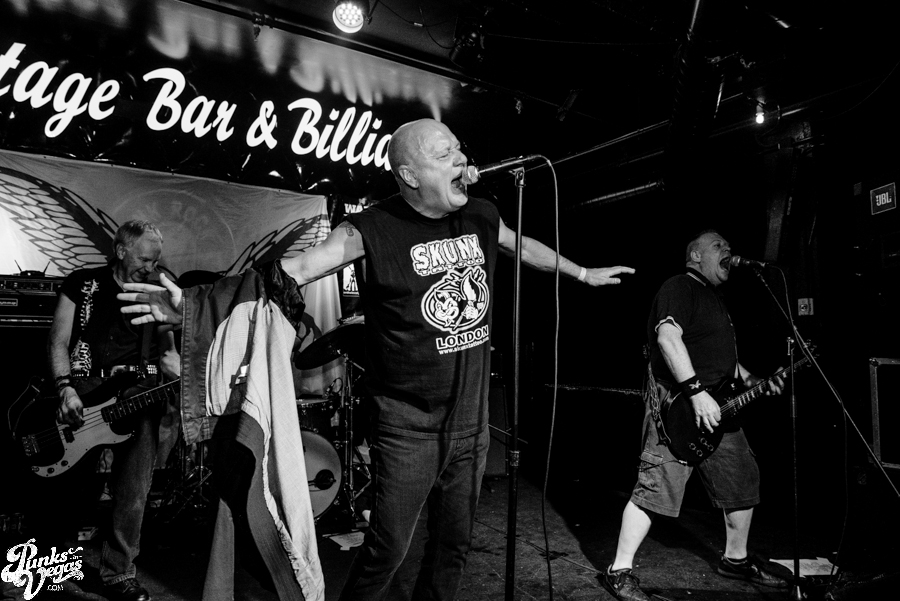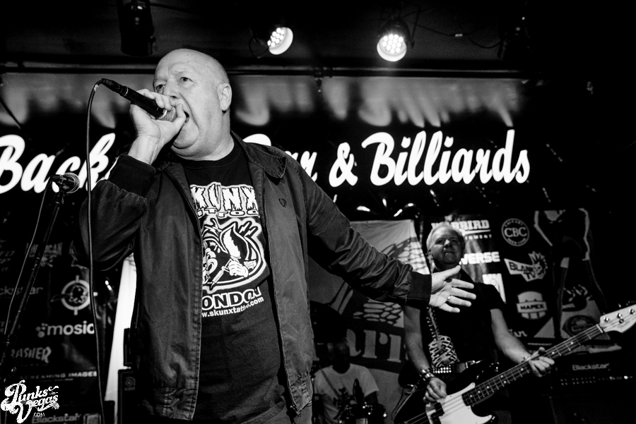 Last time legendary British street punk band Cock Sparrer headlined Punk Rock Bowling in 2011, they also treated us to a special, intimate performance at the Las Vegas Country Saloon. Because of this and their general predilection for playing to fans in small places they were high on the list of suspects for the “surprise guests” spot at the even smaller Backstage Bar & Billiards this year. Official PRB merchandise spoiled the surprise a day early but it did nothing to quell excitement, as fans filed in shoulder to shoulder, hip to hip until the venue was clearly over the 300 some capacity it’s capable of. The combined body heat caused sweat dripping from our brows to become instant steam, giving the room the feel of a humidor by the time the energetic band finally took the stage.