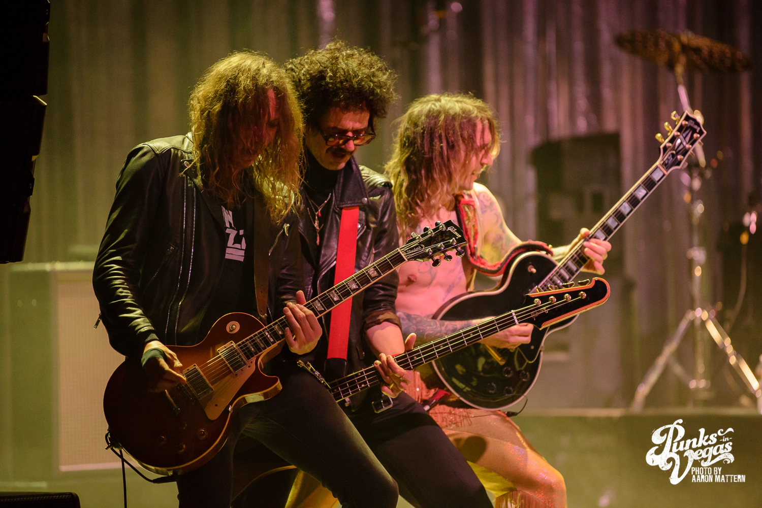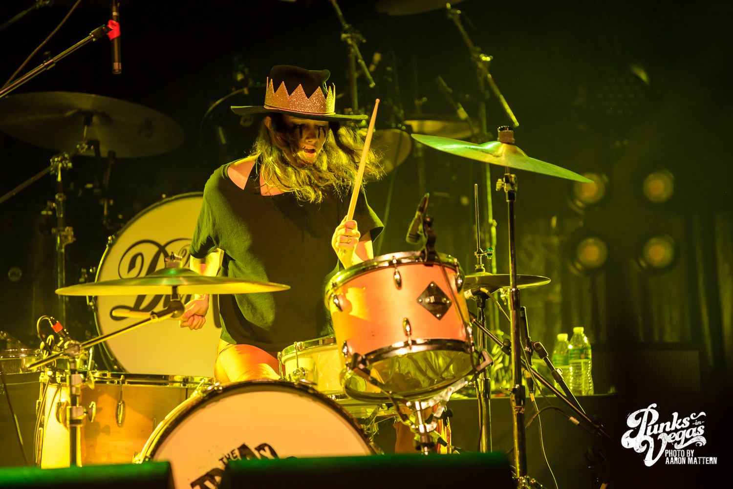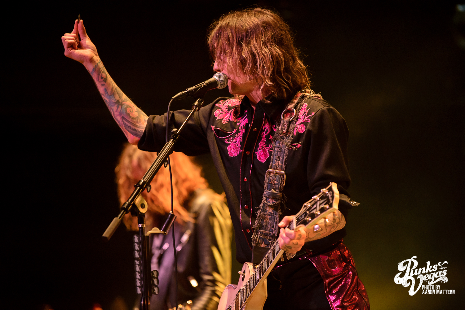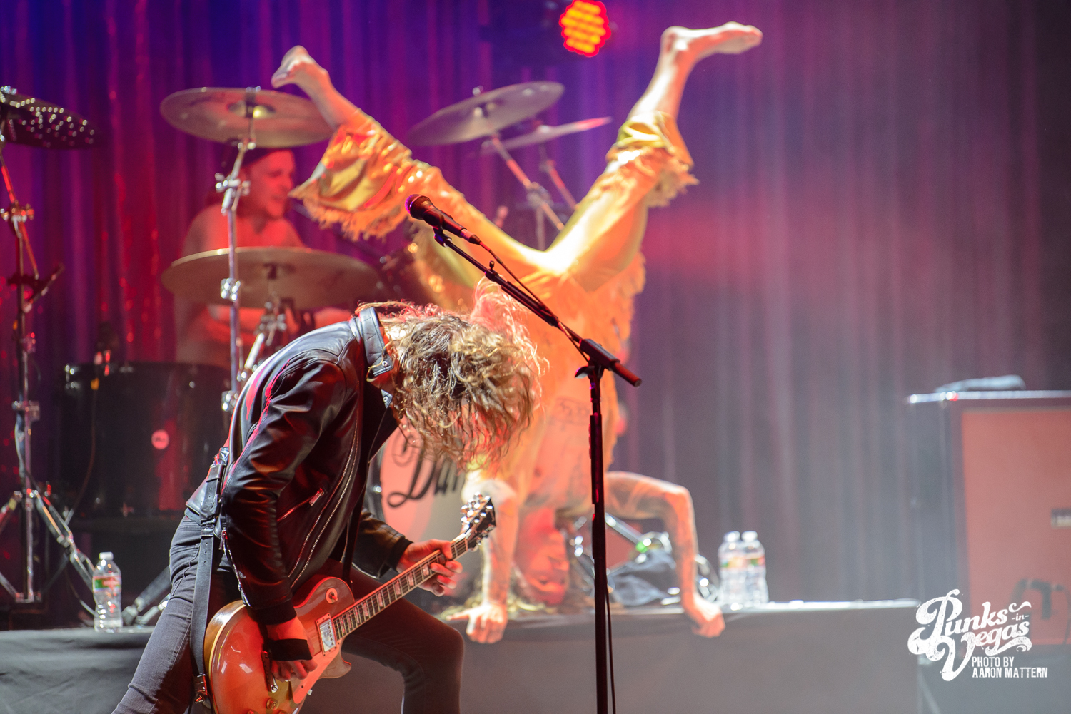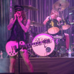 Filling out their opening spot was Nashville’s The Dead Deads, whom I had never heard of at all before. I had no idea what to expect from an opening band for the Darkness, but these three women were so intriguing to watch. Dressed in loud bright clothes, hats, some animal print and with X’s painted in black over their eyes, their image juxtaposed perfectly with their music which is heavy rock n roll with an indie, grungy, vibe. Singer Meta Dead’s voice has a deep, guttural tone which was a big hit with the crowd. The people really loved them and there were many people in the crowd singing along which was cool to see.