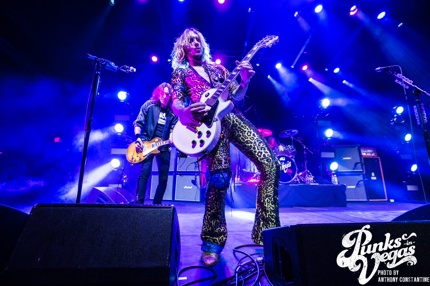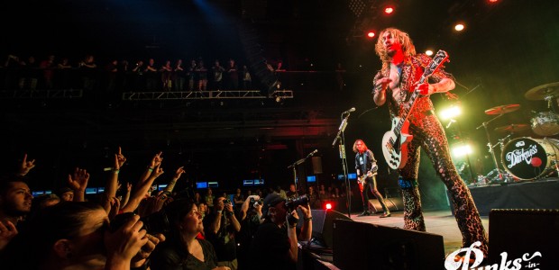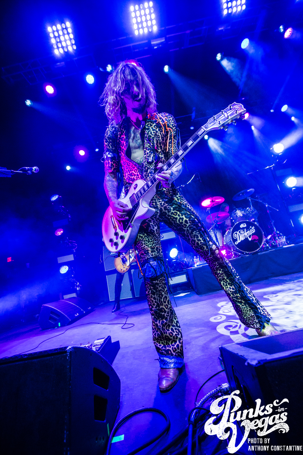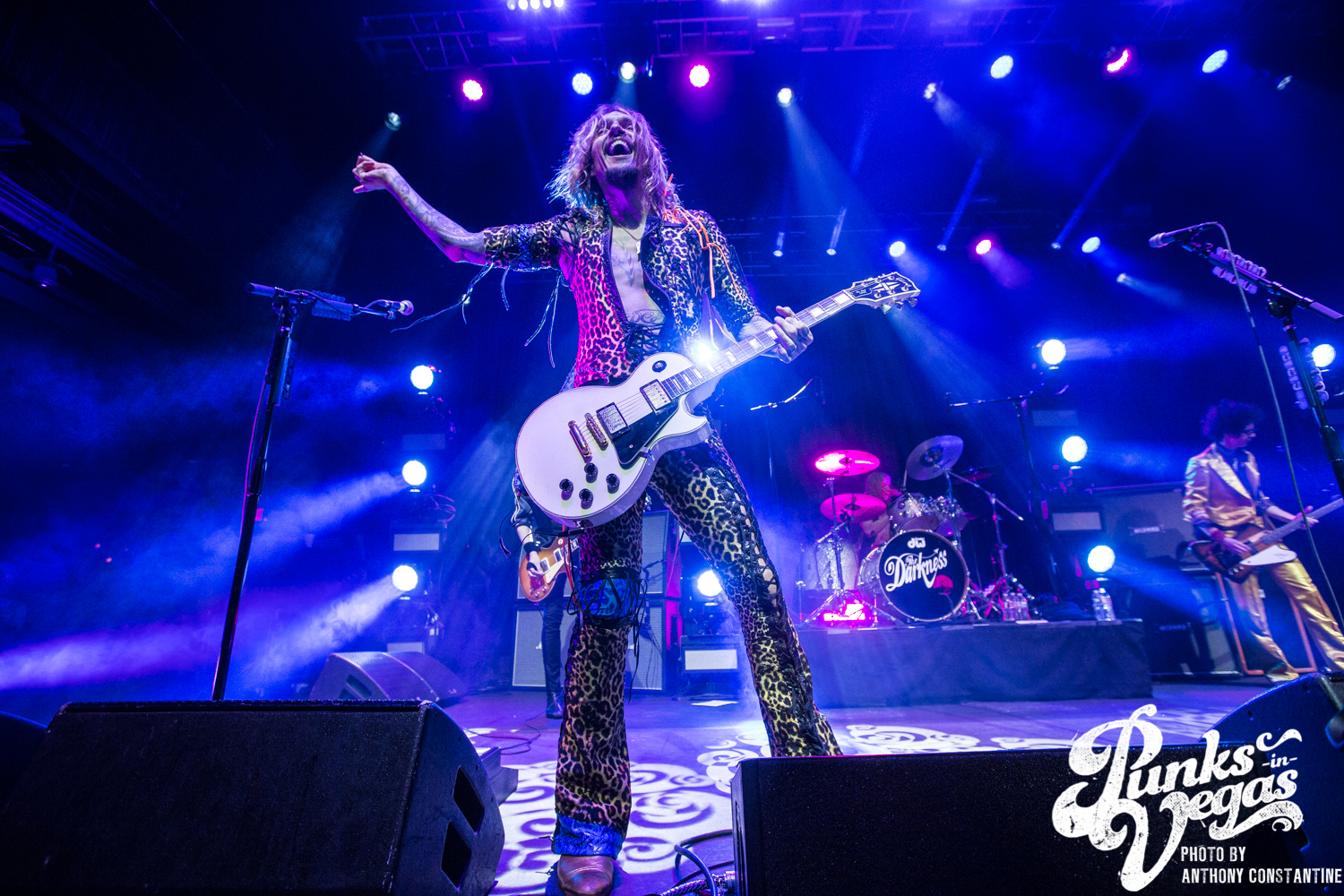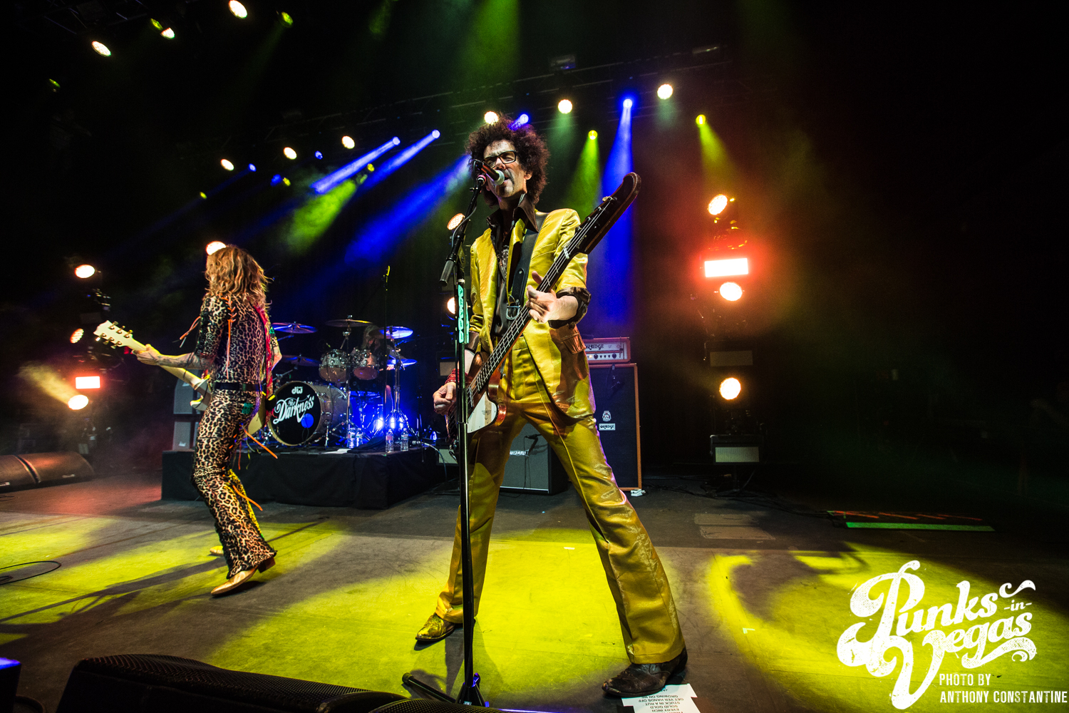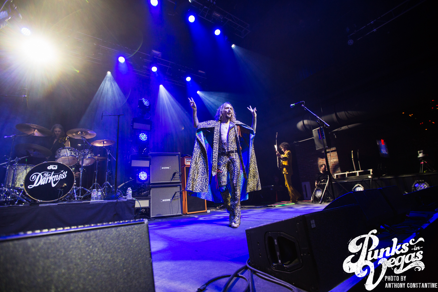 The Brooklyn Bowl went dark and the lights on stage began to flicker and then out came the boys of The Darkness. Lead singer Justin Hawkins strides towards the center mic with arms out wide, adorned in a skin tight, leopard print jumpsuit. The crowd was completely ready for the party to start and from the moment they ripped into the first song the party was in full swing.