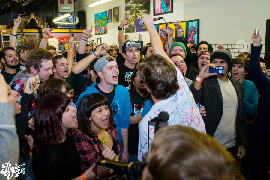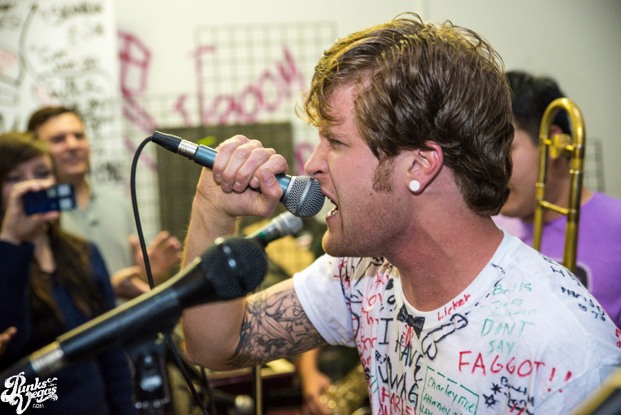 The wall-to-wall fans danced and sang along loudly to cuts from the band’s previous LP Play in the Mud like “Bobby Got a Van” and “Sheep,” the latter of which had the circle pit acting as gospel choir for the refrain of “whoa oh oh oh” reaching numbers not seen since the heyday of Vegas ska legends Attaboy Skip and their shows at the Huntridge and Sanctuary. New cut “Bring on the Suits,” the opener of Just Trying to Fit in… Ur Mom, fittingly opened the release show and had kids crowdsurfing their way up front for a chance to sing along. After a few falls, BLM frontman Charlie Fine decided it would be easier for him to crowd surf out to the fans and allowed himself to be carried – mic and all – back towards the pit. I was happy to hear my new favorites, “Peace Is Uncool” which is reminiscent of Hello Rockview-era Less Than Jake and poppy earworm “Skankin Joe,” the latter of which featuring a special appearance by the titular Joe. Not enough people sang along to the band’s cover of Kid Dynamite’s signature anthem “Cheap Shot Youth Anthem“ (kids! fix this right now and go listen to one of the best songs ever) but the song’s end – “So, come out and raise your fists high, Stage dive, and forget about what they say, Dance the night away” – very much described this release show and hopefully many more shows to come.