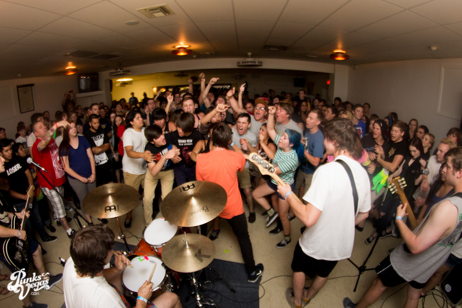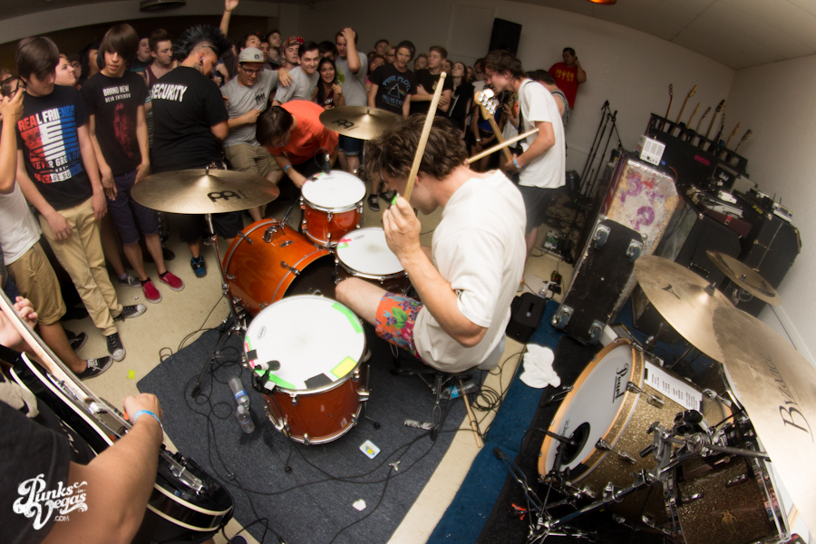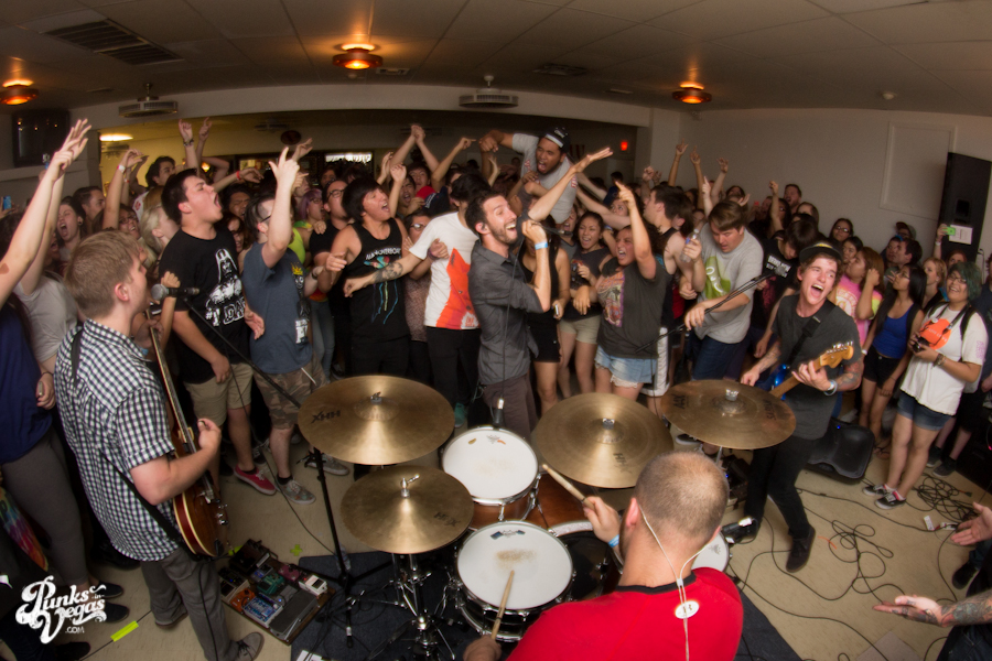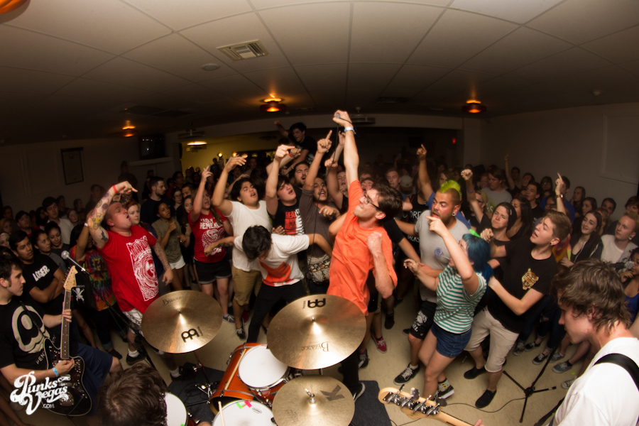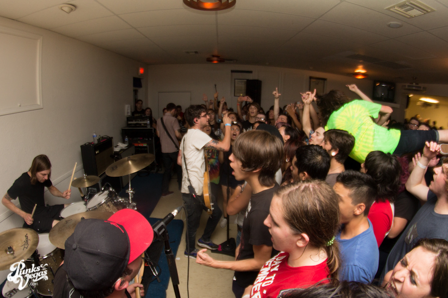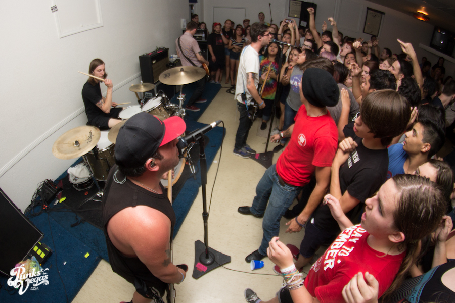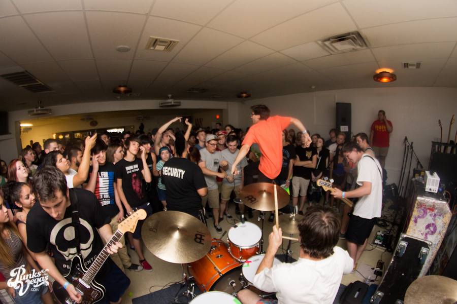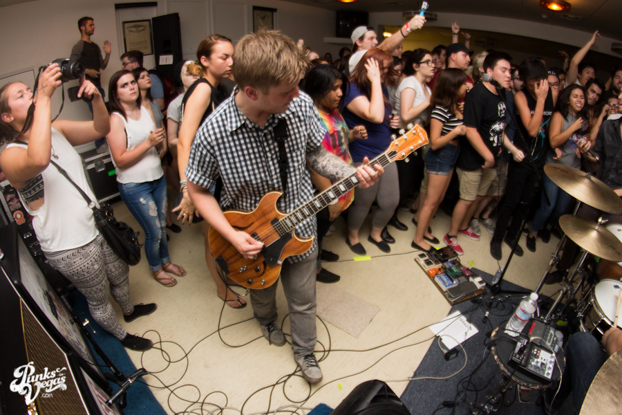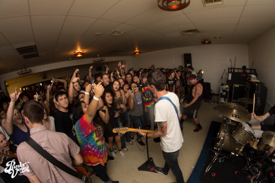 The first touring band of the night was Chicago’s Knuckle Puck. Usually as an opening touring band you have the select few fans that are ahead of the game and already know the words to everything you’ve put out, but tonight was an exception – their crowd was enormous. Maybe it was the few words exchanged between them and Austin Jeffers of local pop punk stalwarts Last Call before their set (Knuckle Puck are self-proclaimed fans of the Vegas pop punk group), or the turn out that got them going, but they powered through their set with such energy that when you went outside afterwards, the desert heat felt cool against your sweat soaked skin. Between each song, frontman Joe Taylor thanked everyone for the great energy they provided, while politely reminding everyone to keep their distance from the drum set as the lack of stage and the rush of fans was causing the vocalist to be slammed into drummer John Siorek’s kit. Taylor told the crowd how it reminded the band of a venue back home, Centennial Lanes, which was nice for them to feel at home while over 1,700 miles away.