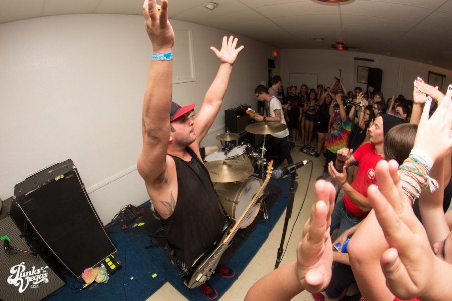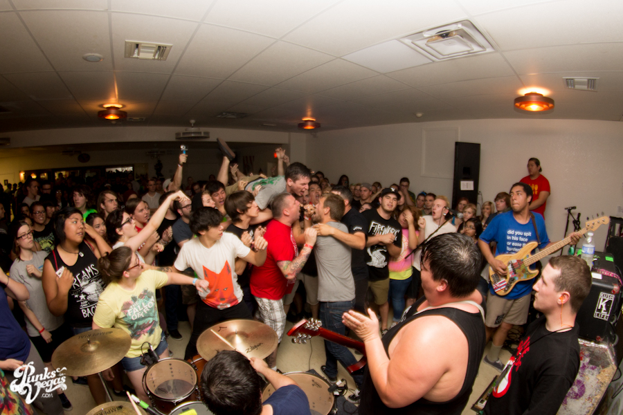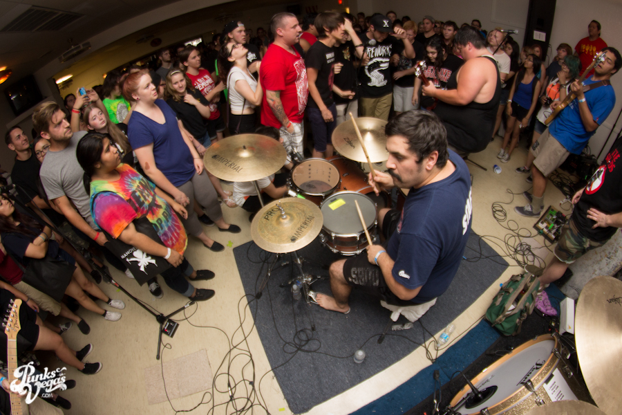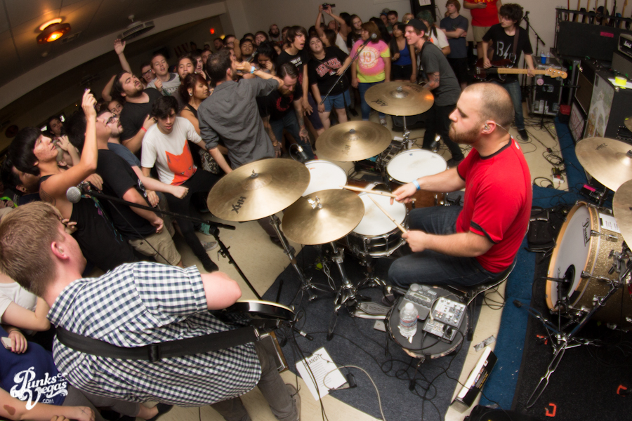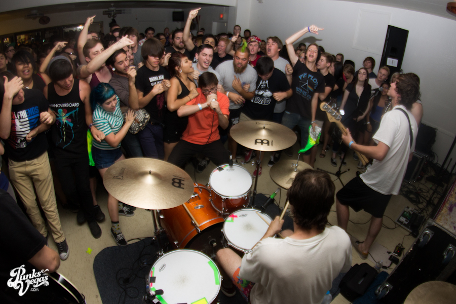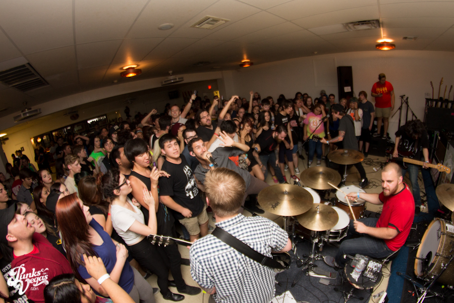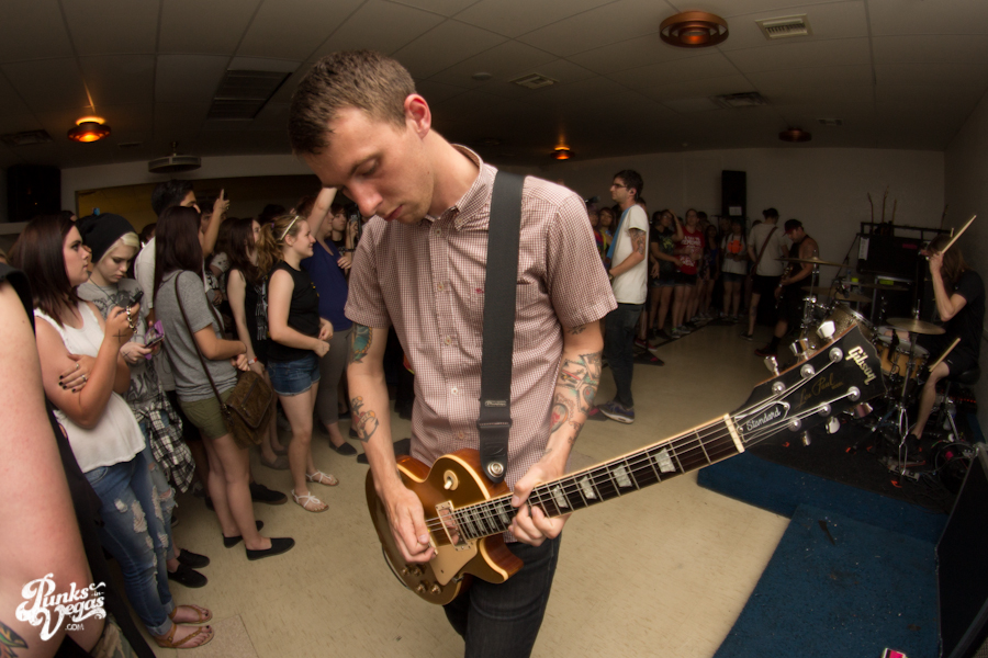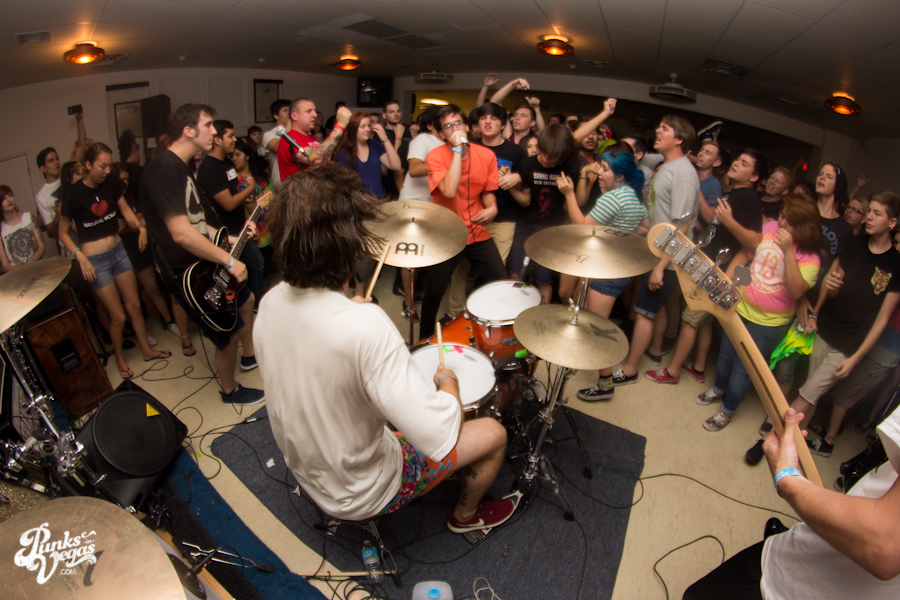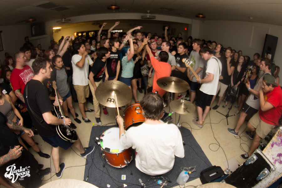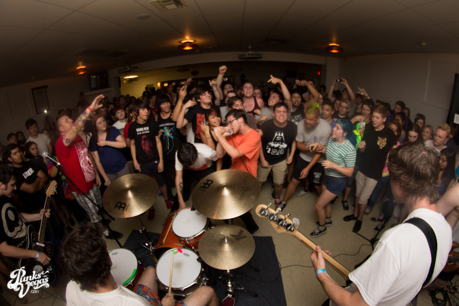 The first touring band of the night was Chicago’s Knuckle Puck. Usually as an opening touring band you have the select few fans that are ahead of the game and already know the words to everything you’ve put out, but tonight was an exception – their crowd was enormous. Maybe it was the few words exchanged between them and Austin Jeffers of local pop punk stalwarts Last Call before their set (Knuckle Puck are self-proclaimed fans of the Vegas pop punk group), or the turn out that got them going, but they powered through their set with such energy that when you went outside afterwards, the desert heat felt cool against your sweat soaked skin. Between each song, frontman Joe Taylor thanked everyone for the great energy they provided, while politely reminding everyone to keep their distance from the drum set as the lack of stage and the rush of fans was causing the vocalist to be slammed into drummer John Siorek’s kit. Taylor told the crowd how it reminded the band of a venue back home, Centennial Lanes, which was nice for them to feel at home while over 1,700 miles away.