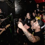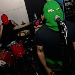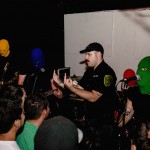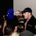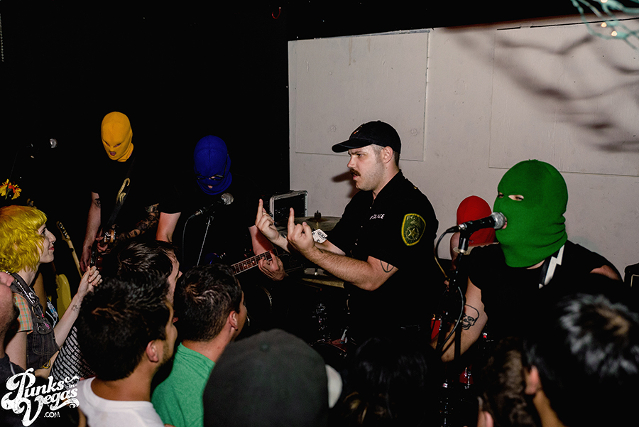 The tour was headlined by Wisconsin’s Masked Intruder, a four piece that plays pop punk in the style of Lookout! Records bands like Mr. T Experience and kerplunk!-era Green Day, taking the usual pop punk love song clichés of pining and serenading and putting them through the perspective of ski-masked stalkers and thieves. They’ve gained a reputation as a must-see live band, so the crowd was pretty excited by the time the lights dimmed and the police siren blared. The band was escorted onto stage by hype man/parole officer Officer Bradford, barely managing to squeeze their way through the sweaty mass of fans to the intimate stage. As they launched right into “Stick ‘em Up,” the whole crowd went nuts, screaming every word back at the band with fists in the air. It was nice to see such frenzied passion on display late on a Sunday night, and the band definitely fed off that, with guitarist Intruder Green dancing like a maniac, leaping high into the air and kicking back against the manic crowd.