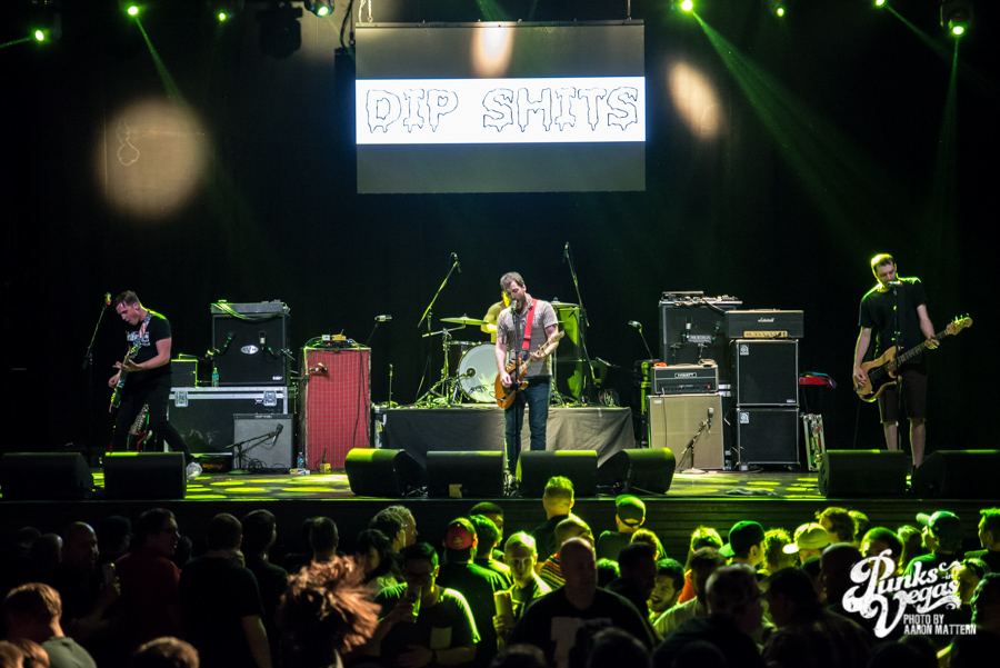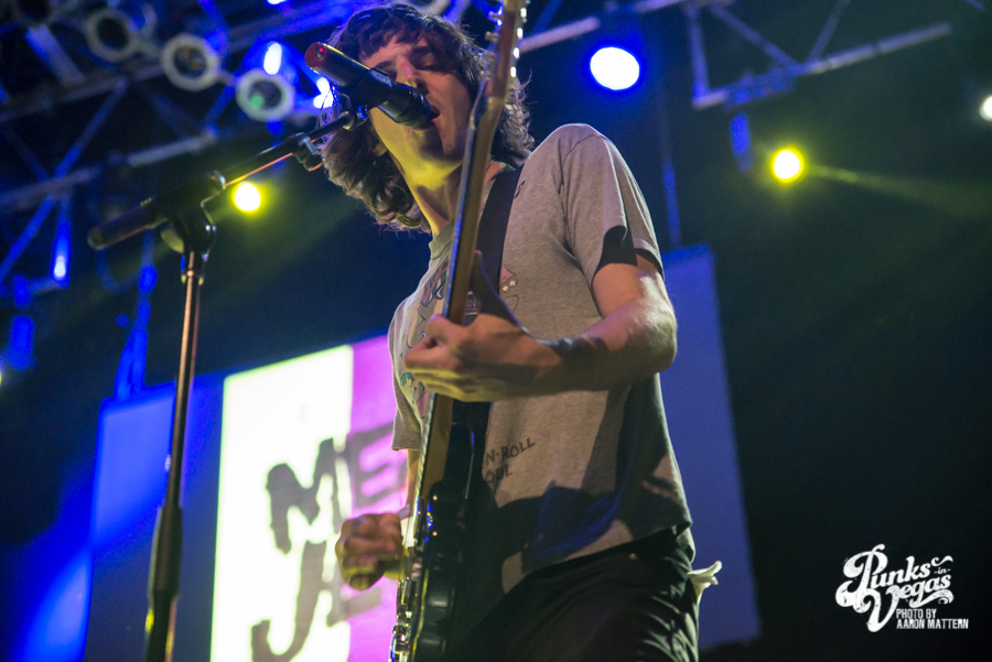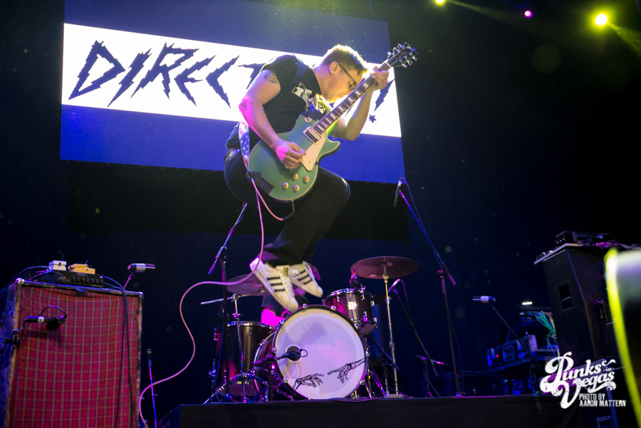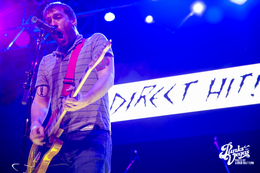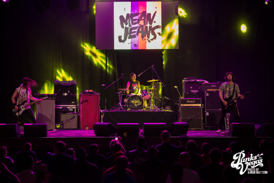 To warm up the crowd, NOFX brought with them Fat Wreck’s two newest signees, Direct Hit! and Mean Jeans. Direct Hit! is a longtime favorite of Punks in Vegas, playing a brand of Midwestern pop punk that is as likely to appeal to Dillinger Four fans as it is zombie and sci fi nerds. Admittedly, the idea of seeing them on this stage, “10 feet above us” as frontman Nick Woods put it, instead of at a cozy bar, seemed like a strange proposition at first.