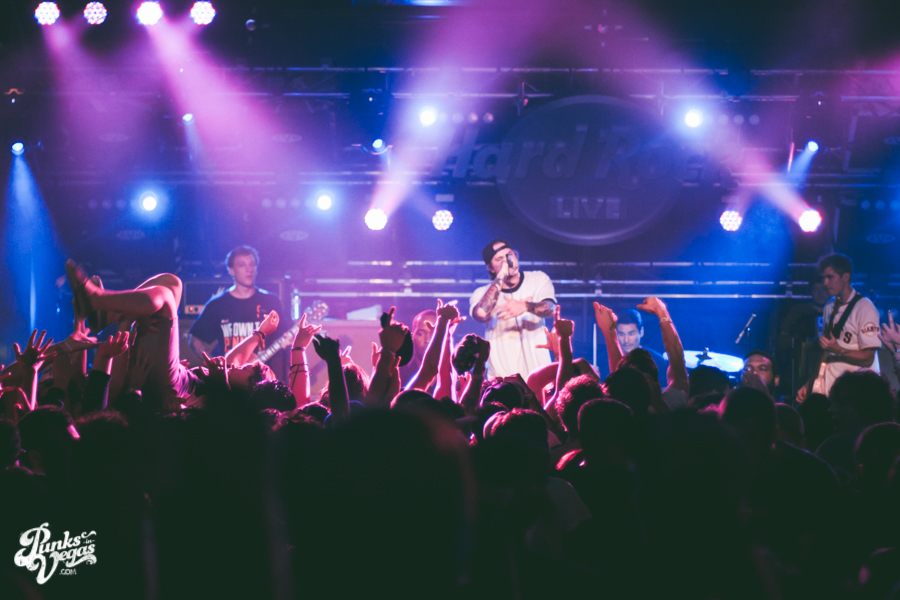 The first band to hit the stage this night was Gnarwolves, and though the opening band would normally be playing to a small crowd, the Hard Rock Live was already packed. The band has been making a name for themselves across the pond, having opened for Blink 182 and playing the main stage of Reading and Leeds Festivals in 2014. On this tour they were the underdogs, but a small pocket of fans in the room were ready to sing along with “Coffee,” “Everything You Think You Know” and especially “History of Bunk,” the latter getting the first pit going of the night. I didn’t know what to expect with these guys and right from the start I was blown away by how much they reminded me of two of my favorite bands – A Wilhelm Scream and Red City Radio – with their gruff vocals and fast tempos. This is one band I could just as easily imagine playing Punk Rock Bowling next year as I could see them playing Warped, and I’m keeping my fingers crossed for that.