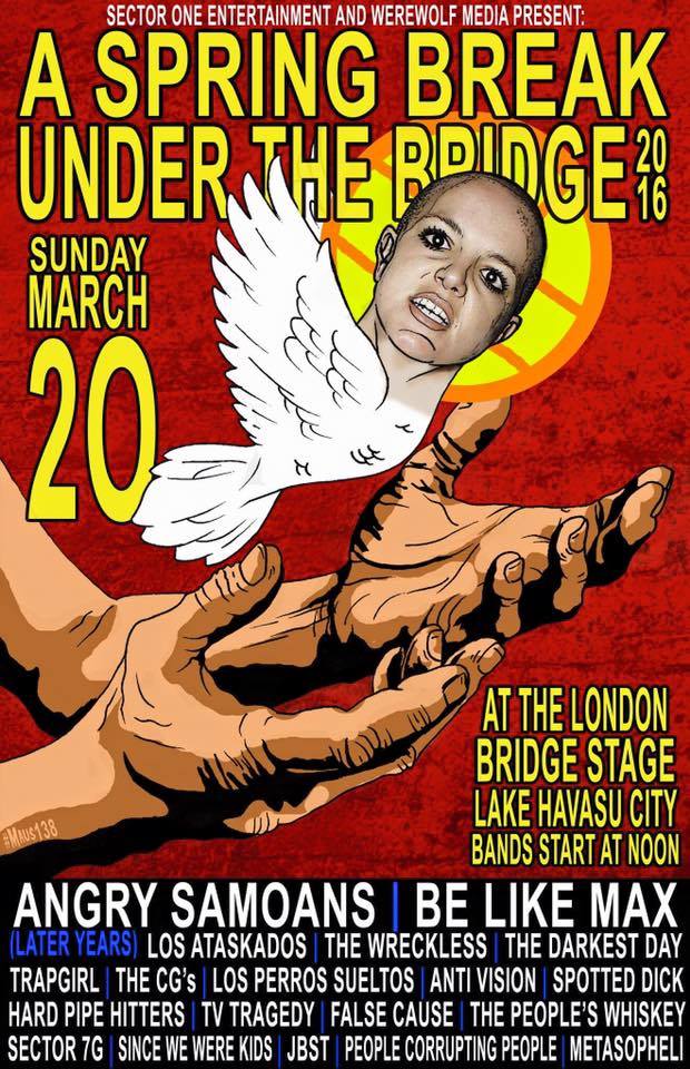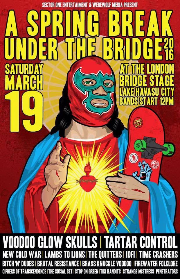 Spring Break Under the Bridge will take place Saturday, March 19 and Sunday, March 20, 2016 under the London Bridge in Lake Havasu, Arizona. The lineup includes Voodoo Glow Skulls, Angry Samoans (later years), Tartar Control, Be Like Max, Hard Pipe Hitters, New Cold War, The Quitters and much more. The event is completely free and all-ages. You can find more information and have any questions answered through the event’s Facebook pages.