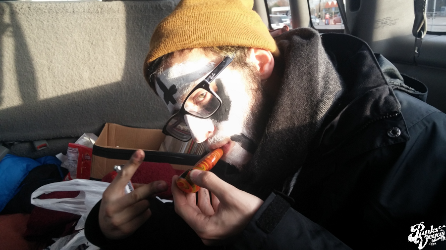 Day 36: Drove 15 hours! Wayyyyy rad halloween basement show! I dressed as a juggalo! Nick was a skeleton! Tyler was a juggalo! Cody was a football player! Zach was a black metal guy! Running Shoes and Odd Dates! Best bands! Strawgunned some beers! Holy shit was this some shit! Fell in love with everyone! Friends! Brand New cover song…