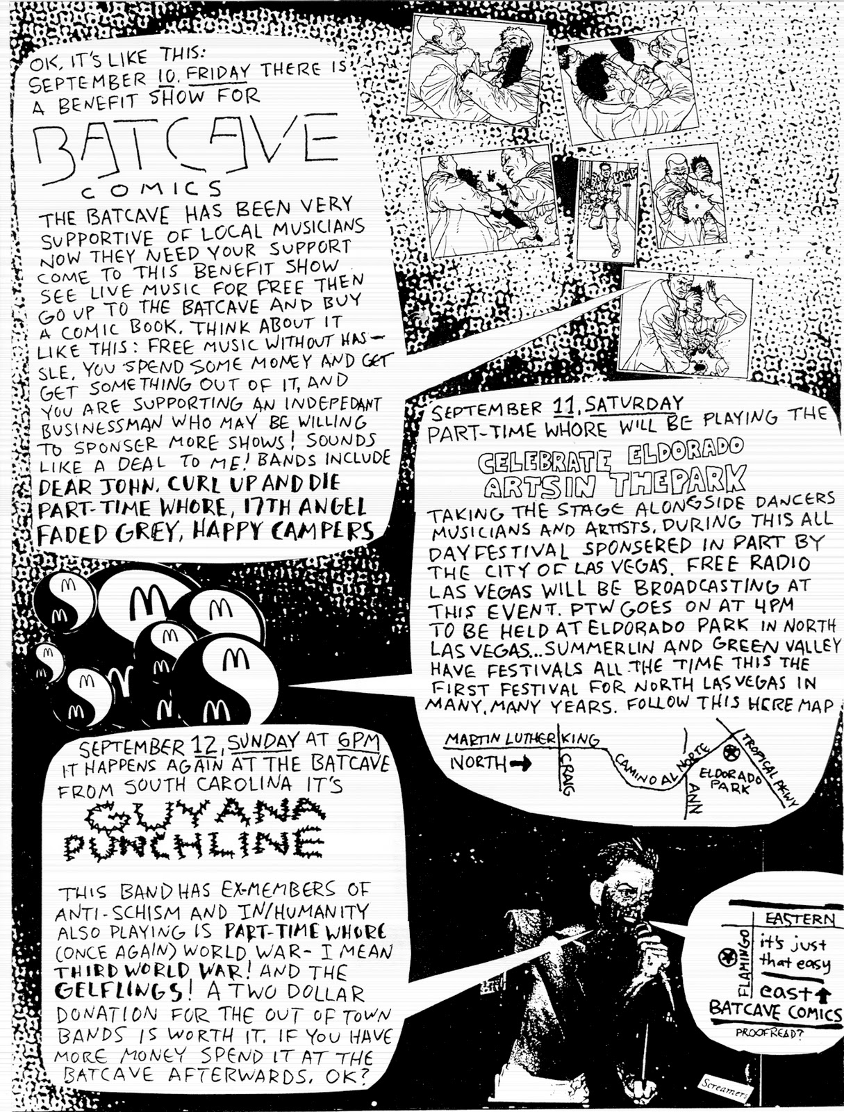 Matt: St. George shows were great, too. I remember hanging out at a McDonald’s on the way there, and clearing the ball pit out. McDonalds used to have these things called PlayPlaces where small kids would play while their parents did shit. We rolled out with garbage bags and emptied it out, then let ‘em all go in the middle of the set we played that night. We also had this thing called the Nemesis Enforcer. Gustavo’s [Mendoza, bassist] dad made it. It was a box covered in carpet with light switches—one of them triggered the strobes, another triggered the wash lights. The strobes were going off, and it became a giant ball pit.