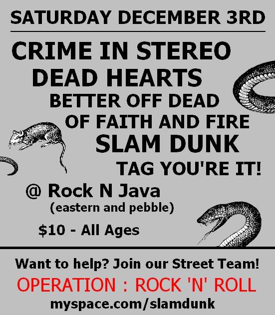 Slam Dunk formed in 2004. There’s not really an interesting story behind how the band came together, so I’ll skip ahead to the good part. We recorded and released our first demo in the fall of 2004, and played a bunch of shows in Las Vegas at various hot dog stores, churches, coffee shops, and other makeshift venues. Around 2006, we had a batch of songs that we felt were ready for the studio treatment, and we got to work recording what would become Rock ‘n’ Roll Is Dead.
