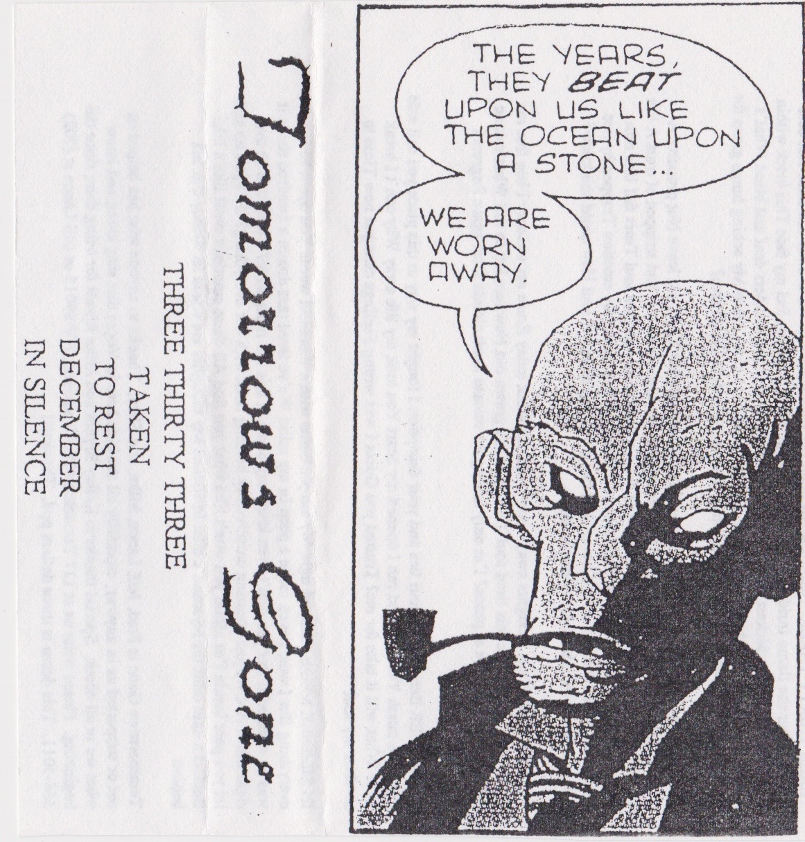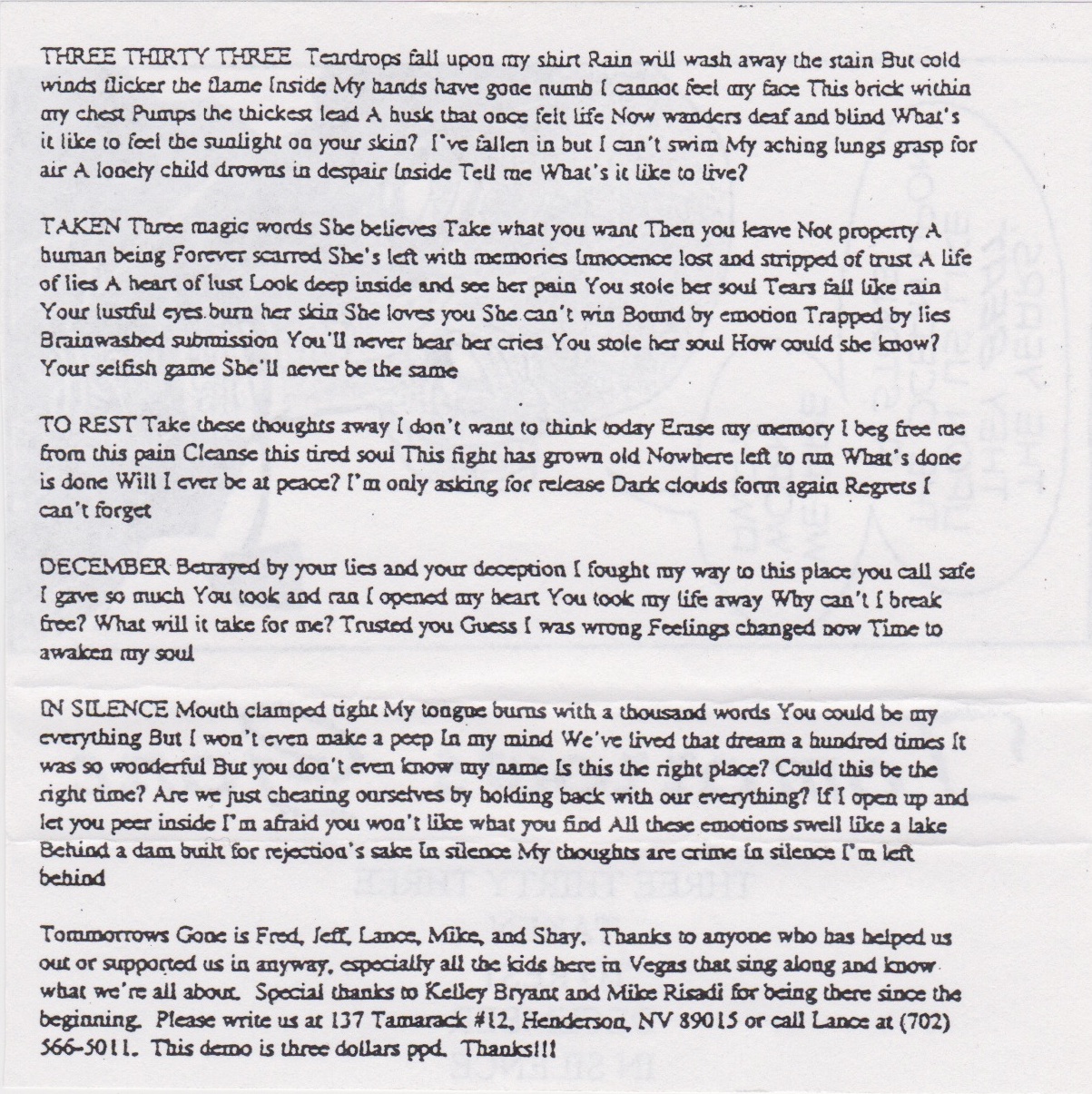 We ended up recording seven songs total, five of which would end up on the second Tomorrows Gone demo. The details of when the second demo was actually released are somewhat hazy, but it seems we may have sat on the recording until 1996 as Mike (Pinaud) is listed as a member of the band on the demo insert. For some reason, we also re-recorded the songs “December” and “Watch Me Fall” from our 1994 demo, but the new version of “Watch Me Fall” was never released until the TG discography CD came to fruition. The songs “Three Thirty-Three” and “In Silence” from the second demo both ended up on compilation records, as did an exclusive track from the session called “Without  a Face.” The line-up for this recording was Fred – drums, Jeff – guitar, Lance – bass and vocals, and Shay – guitar.
