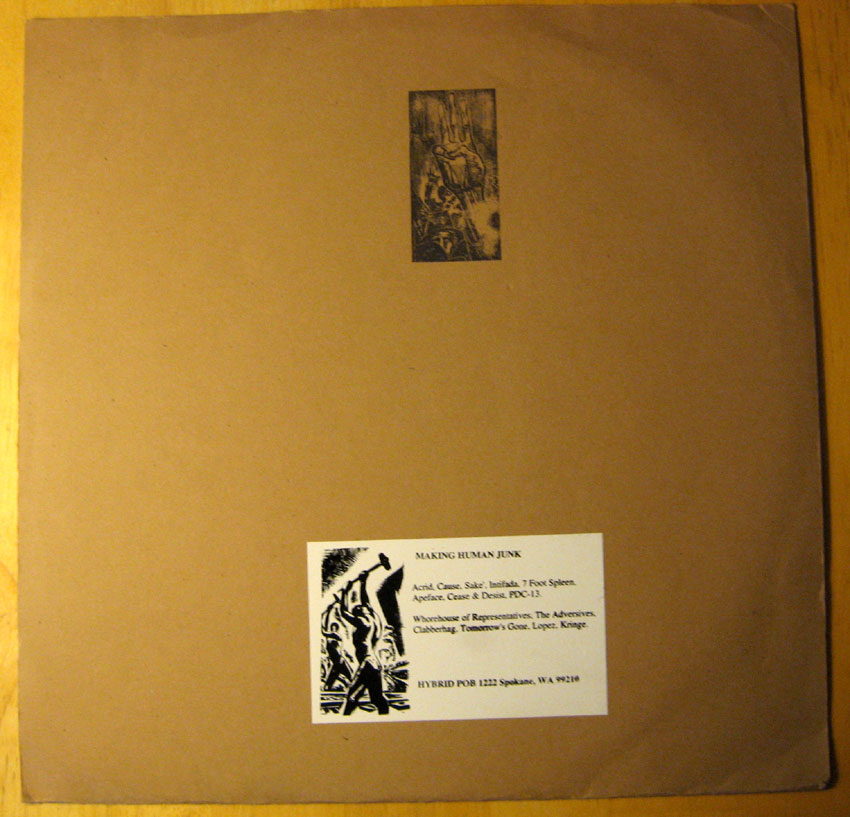 Another compilation we were on was called Making Human Junk, which was a 14-song LP put together by a guy from Spokane, Washington named Micah Prim. From what I recall, Boyde from BFY/Bucky passed along our second demo recording to Micah, and in turn, Micah wrote us a letter asking us to contribute a song for a compilation on his label, Hybrid Records (this was pre-email and all of our communication was done via snail mail). Of course we were flattered by the request and quickly sent Micah the song “In Silence”. The album turned out great, complete with silk-screened covers and a nice newsprint booklet with a full page for each band featured on the LP. Some of the other bands featured on Making Human Junk were Acrid, Apeface, and Whorehouse of Representatives.