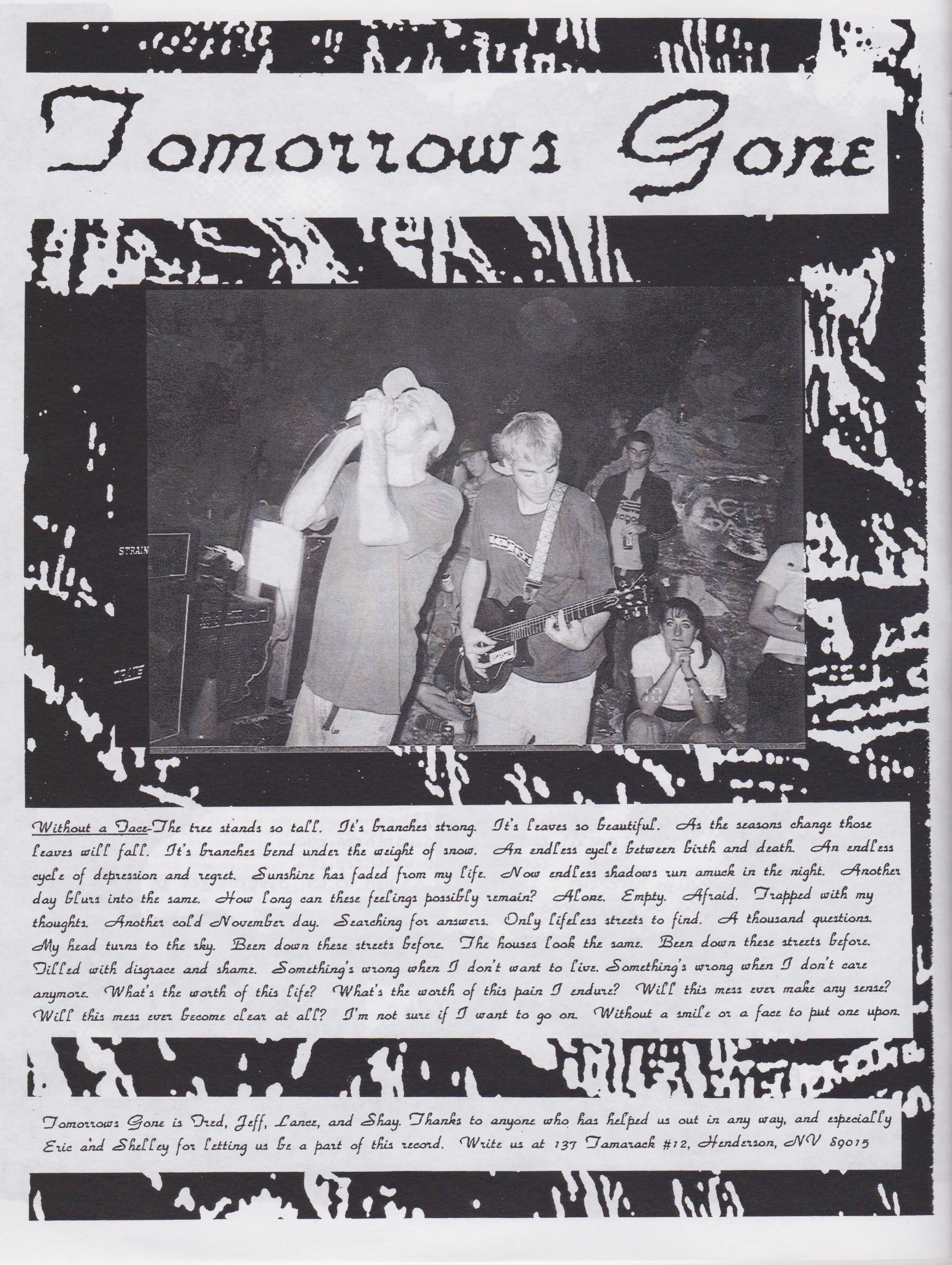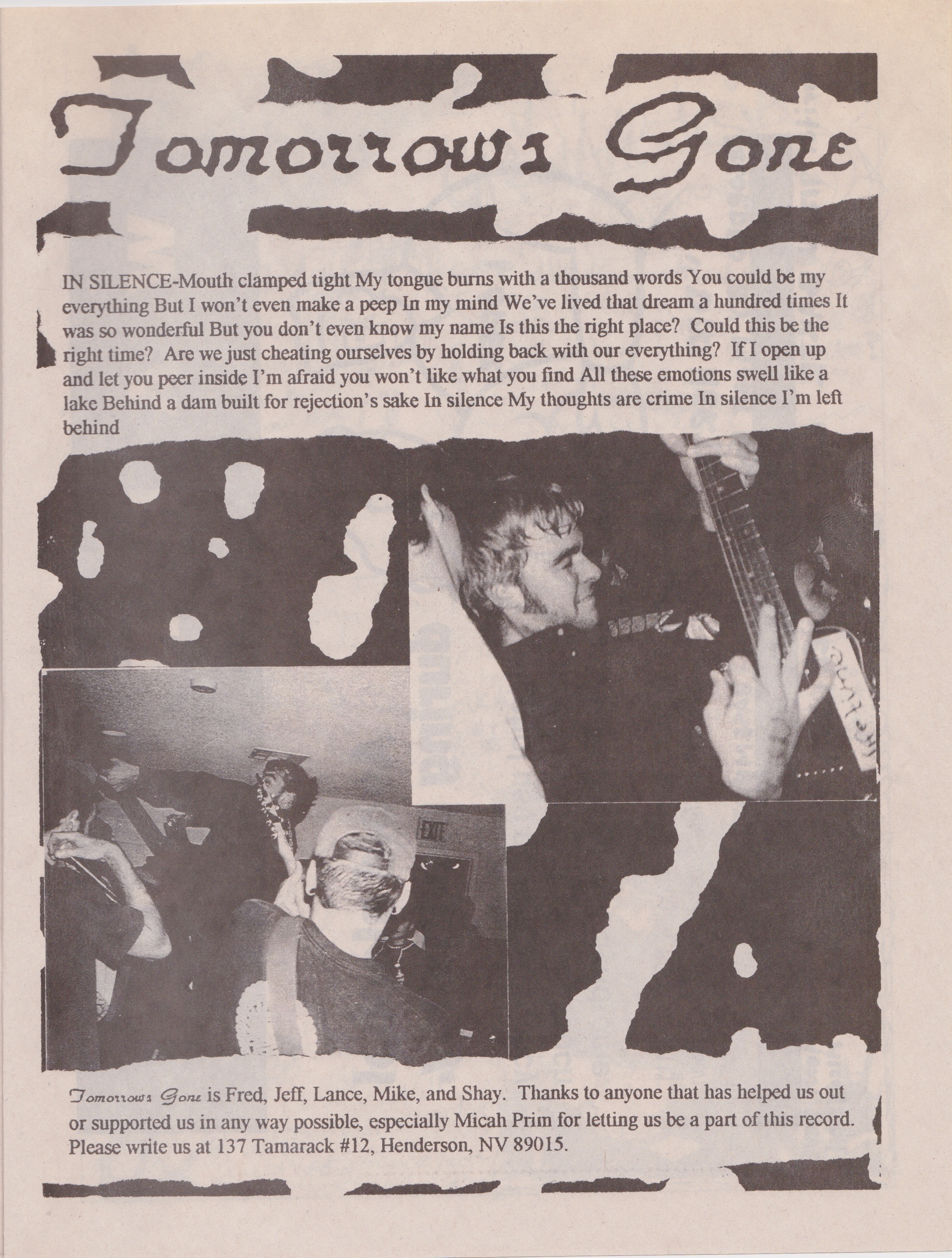 1995 was a rather productive year for Tomorrows Gone. Our demo from 1994 had earned us a small but loyal following, and we were playing a lot of shows at places like The Henderson Elk’s Lodge, The Henderson Jaycees, The Huntridge, The Caves, and The Tubes. We were also writing new songs which would culminate in another recording later in the year.